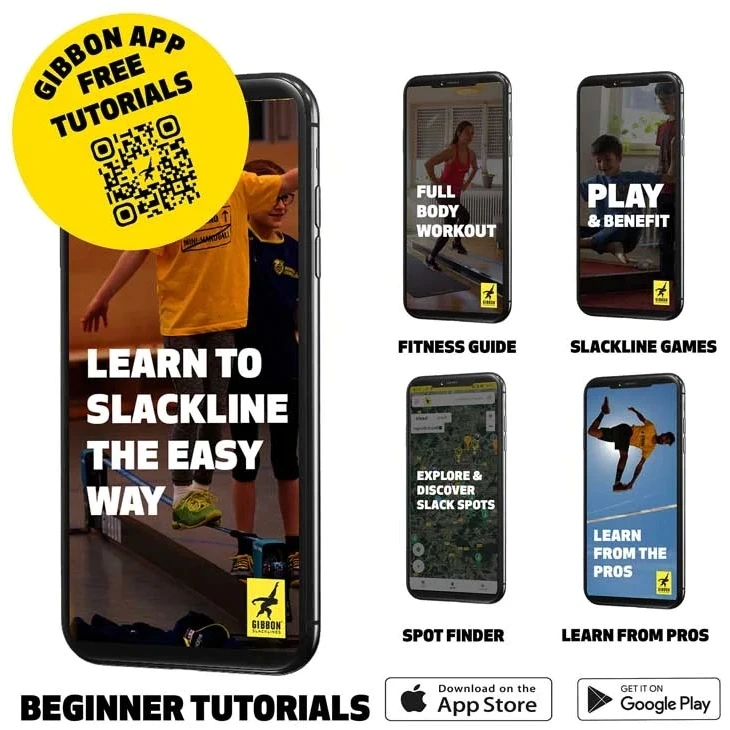 - Gibbon Slacklines BananaLama Treewear Set, blauw-geel, 15 meter (12,5 m webbing + 2,5 m ratelband), voor beginners en gevorderden, breedte webbing 3,5 cm en 2,5 m lange ratelband.